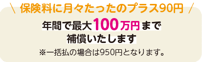 | 90%丨70%丨50% | 90万円丨70万円丨50万円 | 通院・入院・手術 | 制限なし | 制限なし | 年間補償限度額の20% | 年間補償限度額の60% | 年間補償限度額の20% | リセット | 生後31日以上、 満10歳まで |